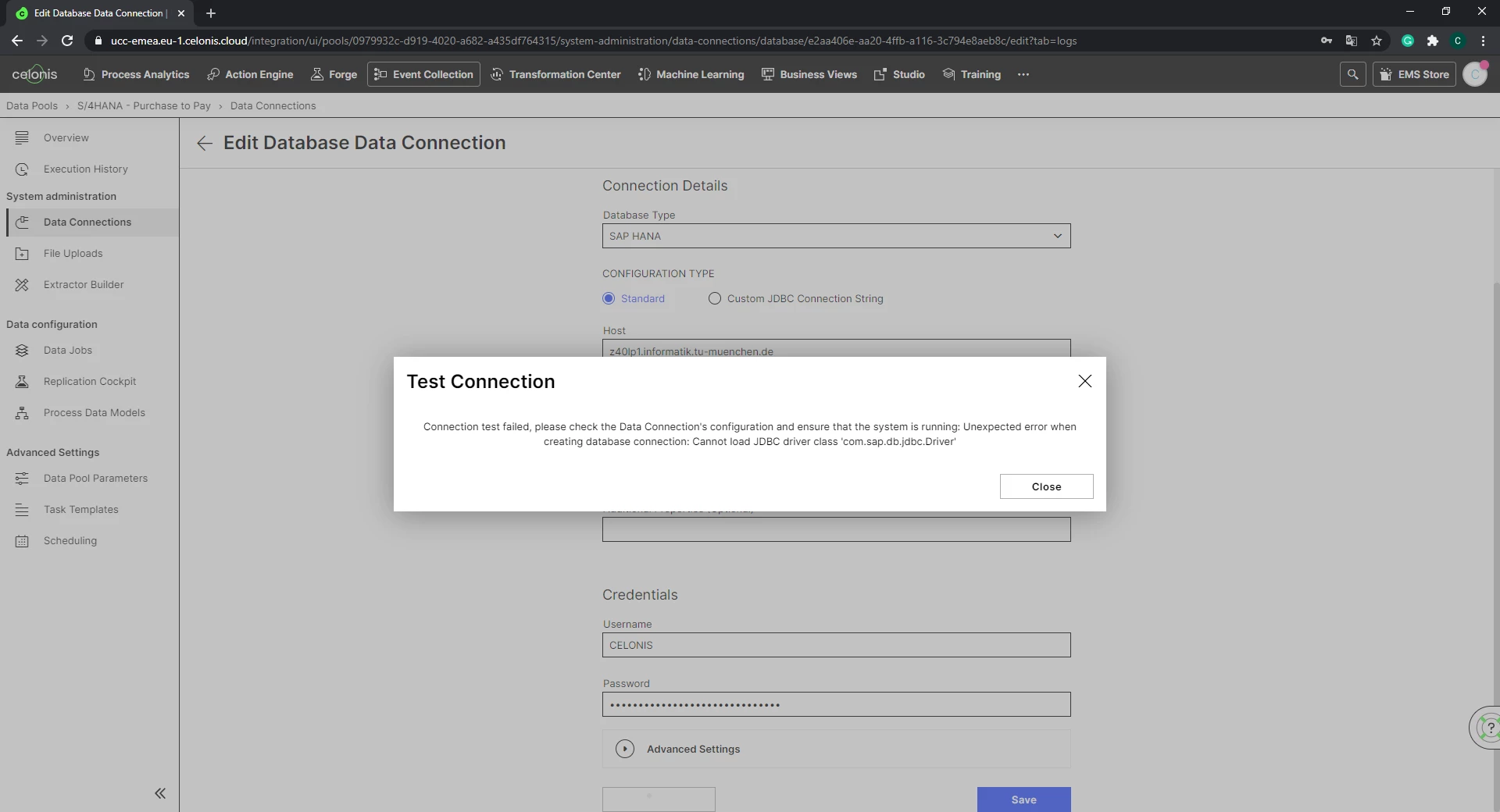 We are facing an issue with the data load since 9th April. We cannot load data from SAP HANA databases anymore. Everything worked till 8.4. We have these issues in different teams (all on eu-1) and for different SAP HANA databases from different hosters. Therefore, it seems that something changed with the driver within Celonis EMS.