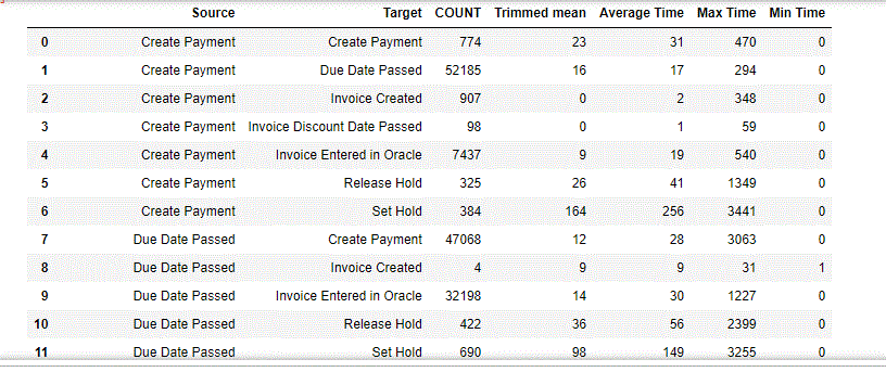 I've also comp up with query to create statistics between each link of activities as shown below. But i'm not sure how would i identify and calculate stats for 'Process Start' and 'Process End'.