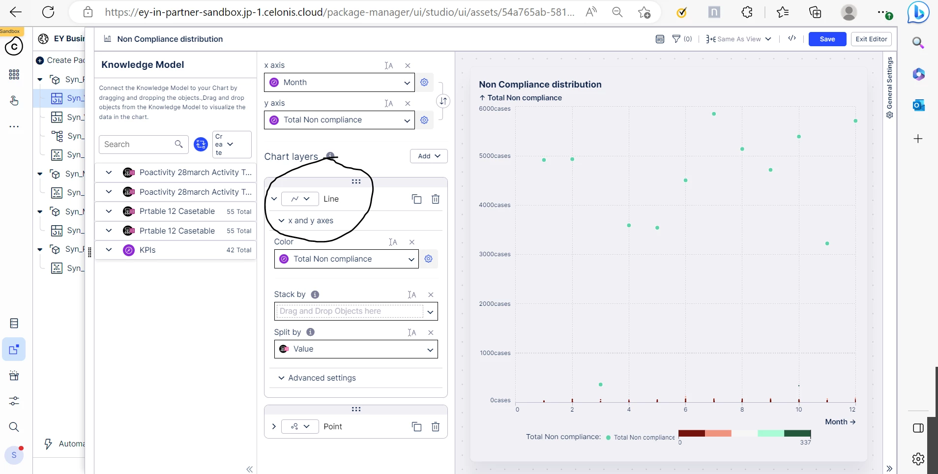 Dear Experts, I am attaching snapshots for my query , Basically I have to create Lineplot with X axis being month at which Non compliance occured and Y axis being Total Non Complianced cases. But even though i tried all permutations and combinations , Line plot is unable to appear and all the time green dots are appearing.
