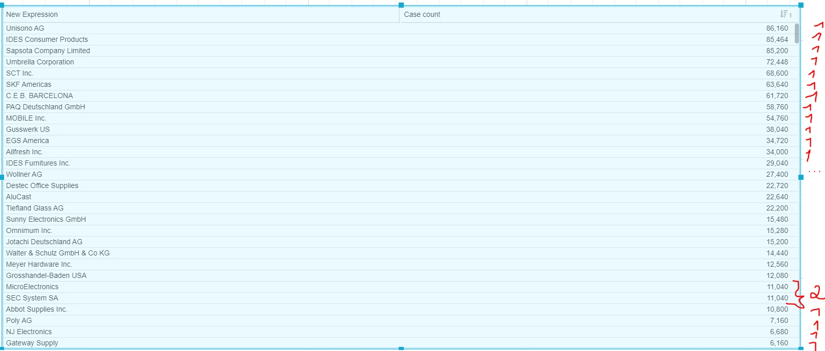 I want to create a new table that shows in a first column the second column of the attached OLAP Table. In a second column the new OLAP Table should show the occurences of each distinct number of column two from the attached OLAP table. I indicated with the red numbers on the right the occurence count i expect to be seen in the new OLAP Table (in the new OLAP Table the number 11,040 would only be displayed once in the first column and in the second column would be a 2 because two different vendors are linked to that specific case count).