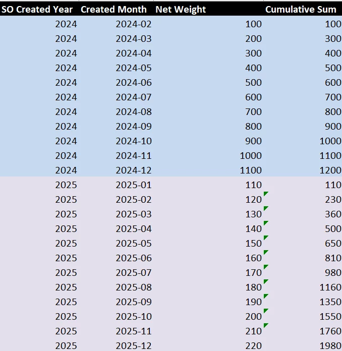 I want to calculate cumulative sum for column ‘Net Weight’ by Year . Below picture is result i want to have.