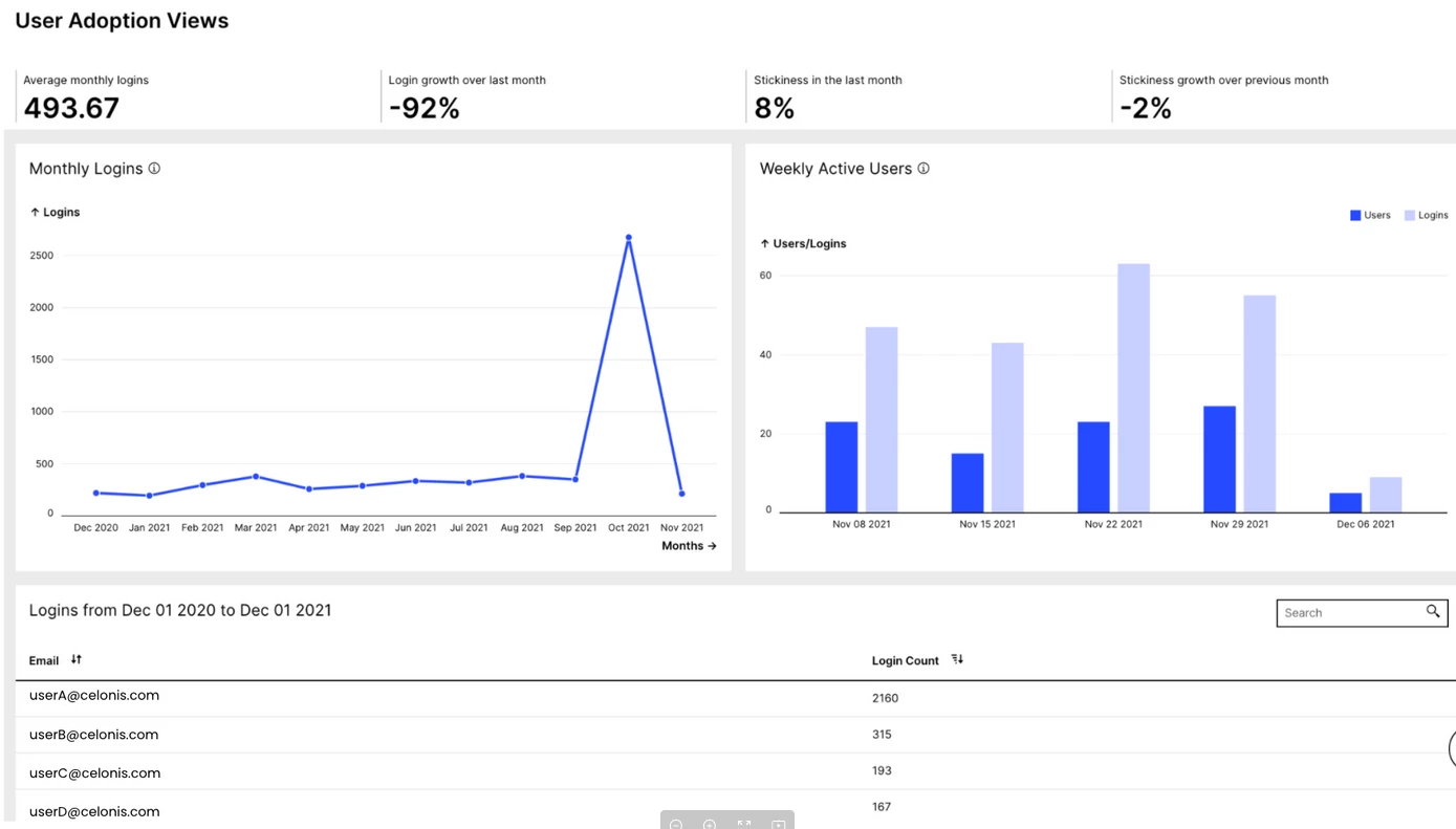 1) Number of active users can be obtained by using option: "Enable Login history" in Team settings > Logging history. After doing that you can either use "User Adoption Views" dashboards or export the csv file, that can be analyzed with flat file upload. More info in <your-celonis-link>/help/display/CIBC/User+Adoption+Views