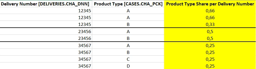 How can I calculate the Share of Product Type for each Delivery Number?In the enclosed screenshot, I'm trying to calculate the yellow column. I tried by using the PU_X functions, also combined with 'DOMAIN_TABLE', but I couldn't get any kind of