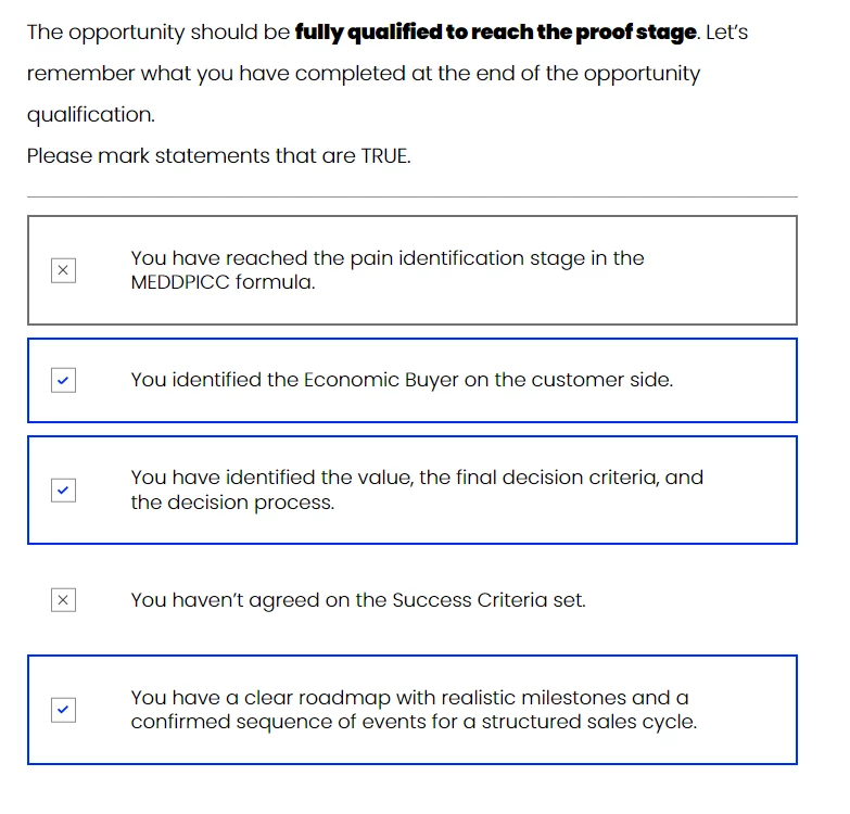 can you explain me why the first answer is false? I would say that it is false because when you use the MEDDPICC forumula you are just trying to confirm pain points and then you would need an executive alignment to end the phase of "qualify the opportunity" and so