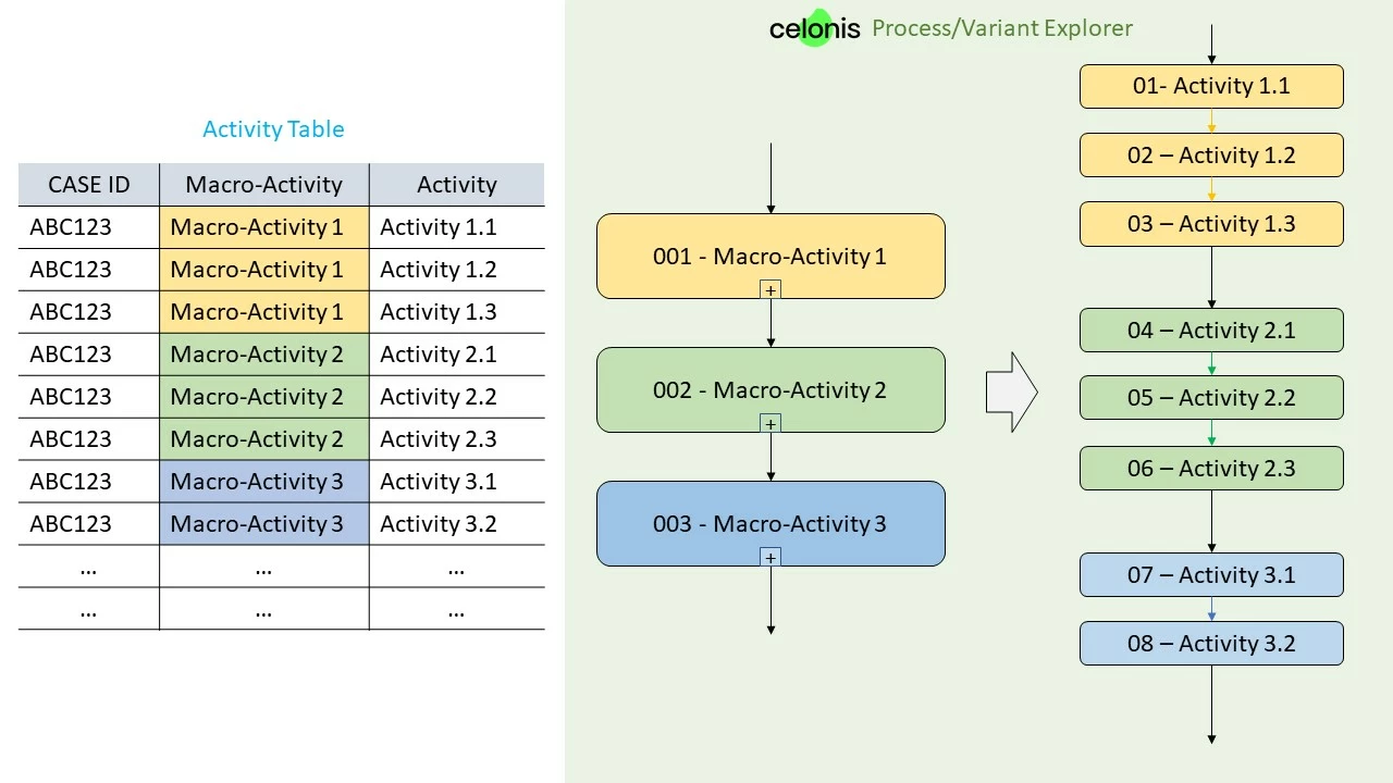 To better explain , I am attaching an example image, in which you can see that both the Macro-Activities and the Activities are listed in the activity table, and the ideal view that I would like to obtain is on the right.