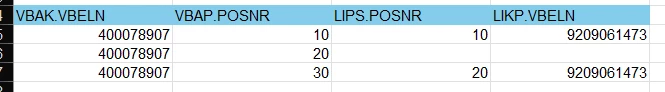 VBAK 1:N VBAP 1:N LIPS N:1 LIKPMy challenge is to display a document flow within a table. This works - but only for VBAK/VBAP dataset which have an following LIPS/LIKP dataset.