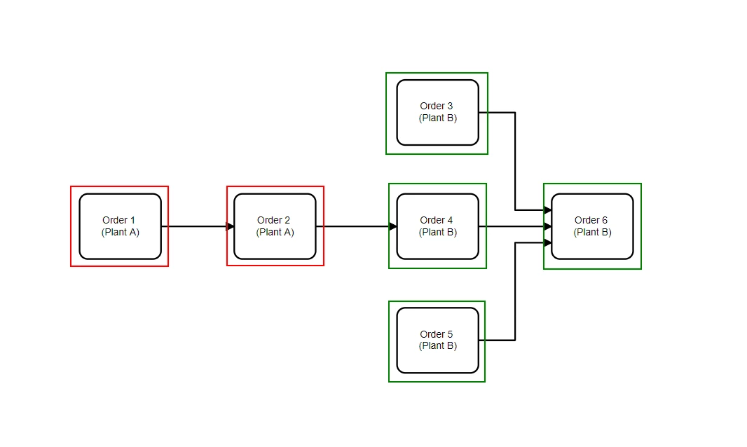 However, in this case, we only want to see the orders, that are created in the same plant, not from previous plants. E.g. in the following examples, the 2 first orders 1 and 2 of Plant A should not be selected, if the variable is set to Order 6.