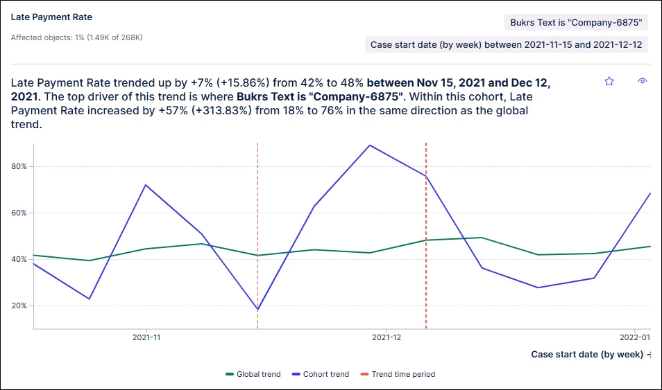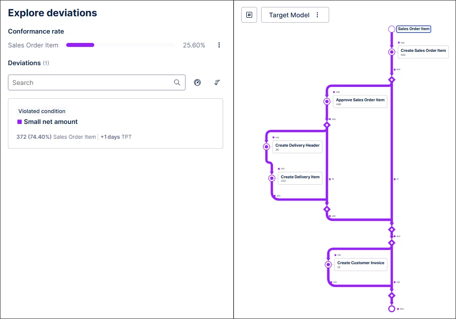 This means Process Adherence Manager now supports conditions saved in your Knowledge Model. This allows you to view their specific effect on conformance rate, throughput time, and other KPIs.
