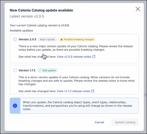 We’ve refined catalog workflows for teams on v3.0.0+ to prevent breaking changes. Auto-updates now only apply to minor patches, while major releases require manual approval. This gives Data Engineers stable environments with the flexibility to choose when to upgrade.