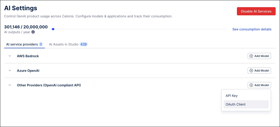 Admins can now add custom OpenAI compliant models (BYOM) using OAuth 2.0 (Client Credentials flow) as a secure alternative to the default "API Key" method. This new option enhances security and flexibility for AI integrations, connecting your Celonis products to a wider range of third-party model providers.