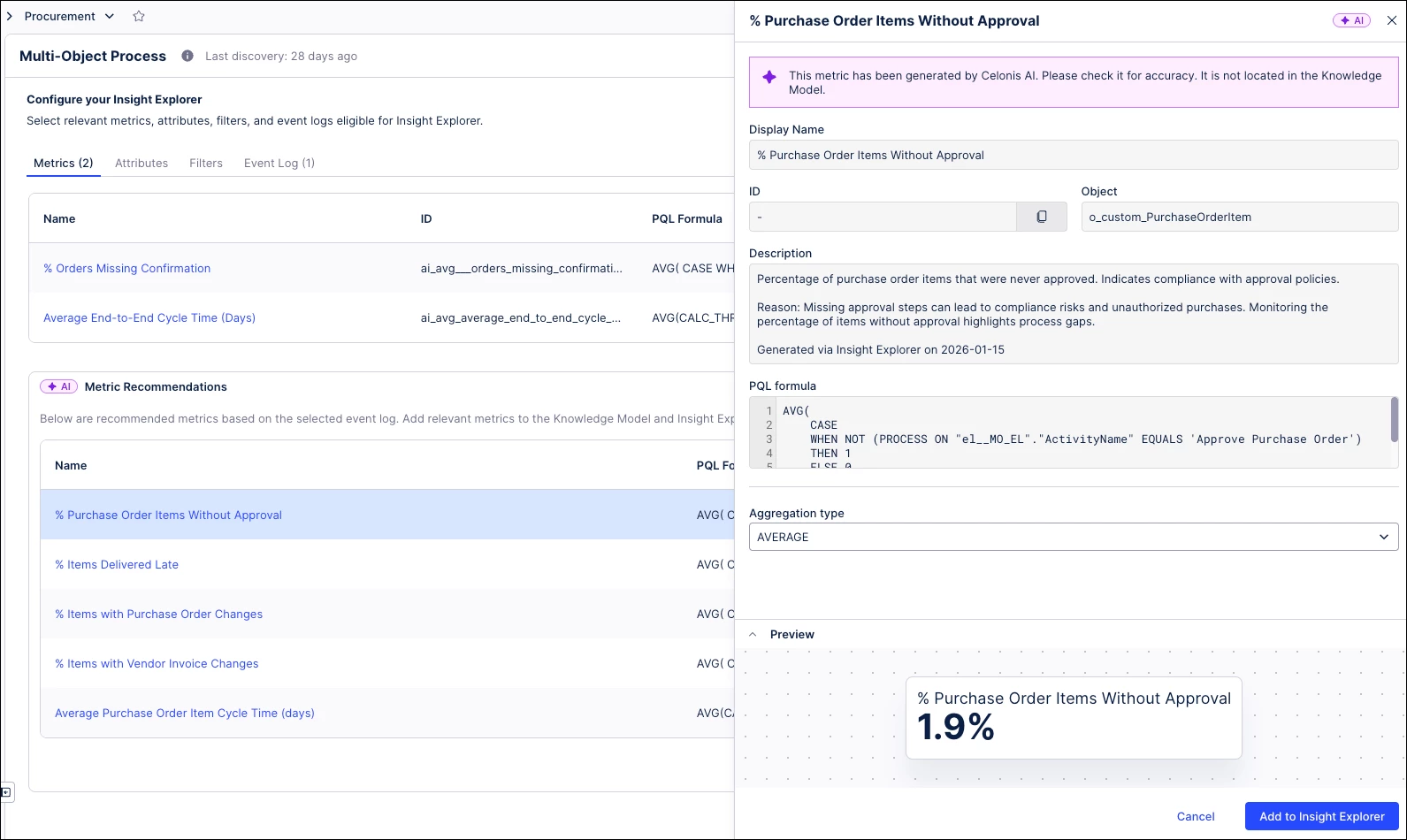 Insight Explorer now uses AI to suggest specific process inefficiency metrics based on your event logs. Analysts can instantly add these Metric Recommendations to their Knowledge Models to uncover hidden bottlenecks they might have otherwise missed. This update moves beyond manual analysis, using AI to fast-track your path to process improvement.