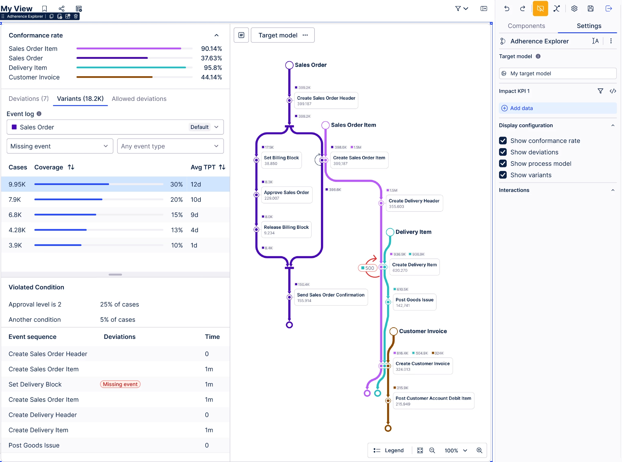 The Adherence Explorer is the new analysis experience for Process Adherence Manager. It's a Studio View component that enables users to analyze deviations in the context of a broader analysis (such as building a dashboard with the conformance rate of a model). It seamlessly interacts with other View components, including charts, tables and Process Explorer.