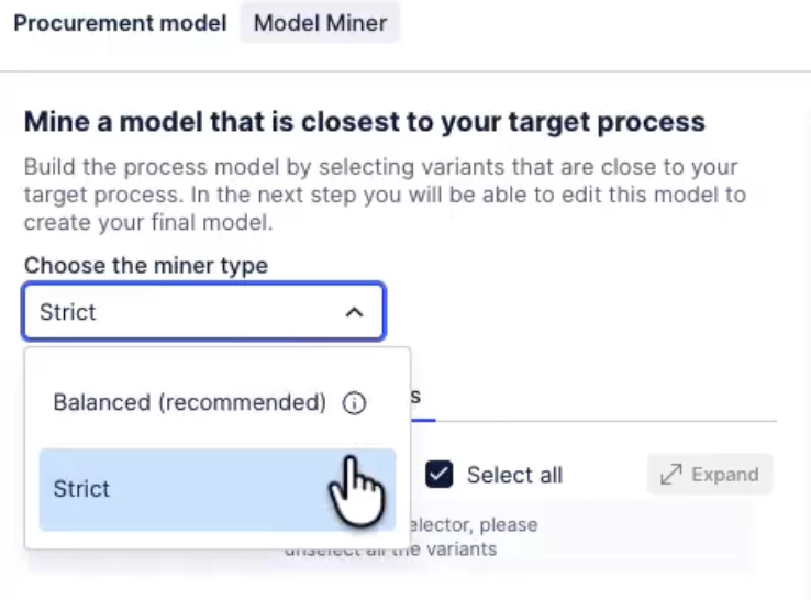 Users can now choose between the strict or balanced model miner when mining a model. Both options analyze the process graph derived from an event log and try to match the patterns of events within the process graph. They use different approaches where patterns of events can’t be matched. The strict miner considers every variant in a model, while the balanced miner optimizes for fitness, making it better suited for processes with many variants.