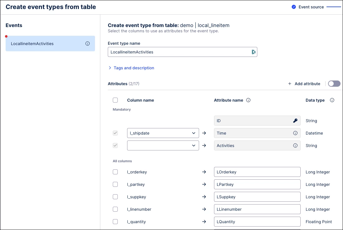 Data Engineers and Analysts can now create event types directly from raw source data using a streamlined import wizard. This replaces manual SQL mapping with automatic transformations for event logs and change tables, enabling faster bulk event creation.