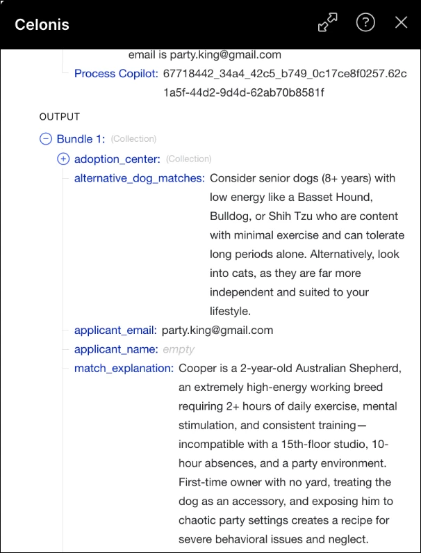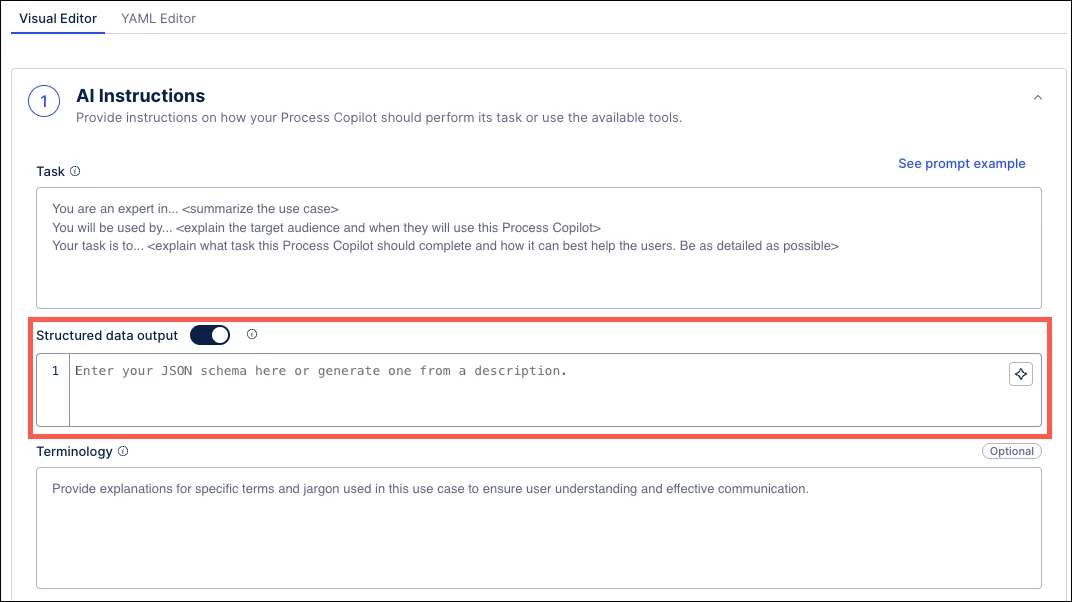 Process Copilots can now generate structured responses using customizable JSON schemas defined in the AI Instructions. Structured outputs provide predictable and system-ready responses, enabling seamless integration with Action Flows, Orchestration Engine, and external APIs - without manual parsing or error-prone text processing.