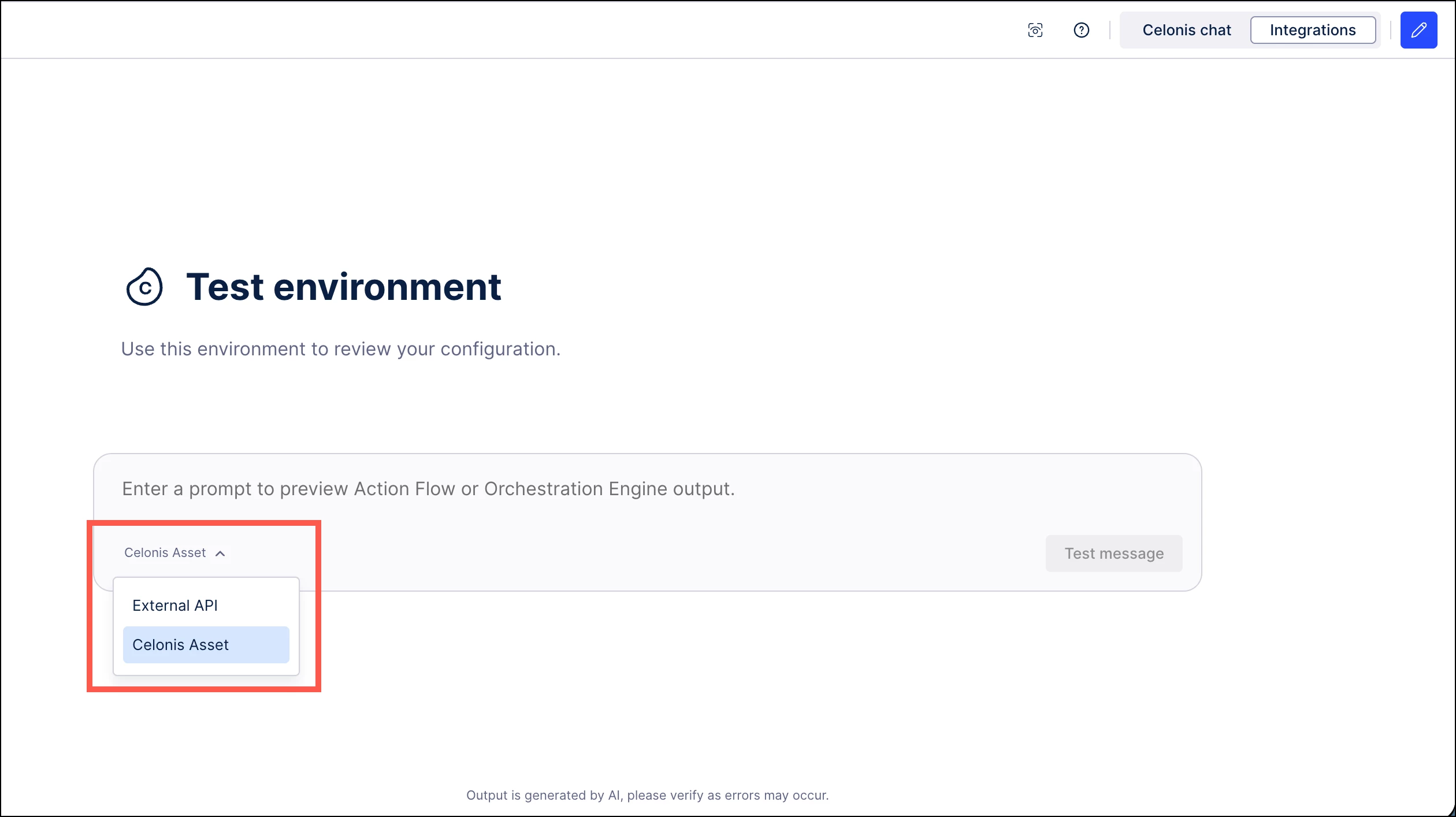 You can now switch between data sources (Celonis Assets and External APIs) when testing Process Copilots directly from the chat interface. This provides greater control when validating Copilot behavior, allowing you to simulate different execution scenarios and ensure accurate reasoning across internal and external integrations.